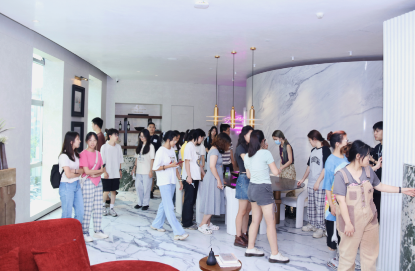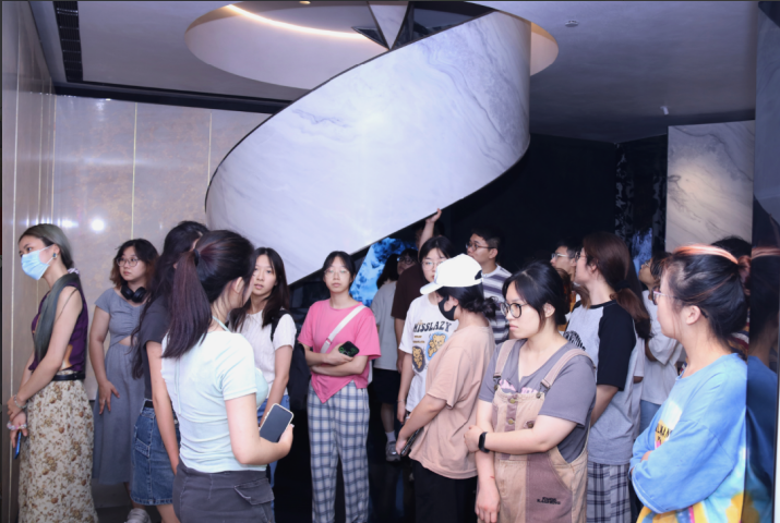 在歐若拉精工奢石高定館的參觀環節中,多位產品技術人員向廣美研學團一行進行了細致講解,向同學們詳細闡述了歐若拉精工奢石產品的創意設計、環保理念以及特色應用,大家也被品牌的獨特設計和獨特質感所吸引。同學們通過親自體驗和實際操作,感受到了創新設計所帶來的無限可能性,領略精工奢石產品與設計融合所創造的獨特魅力。